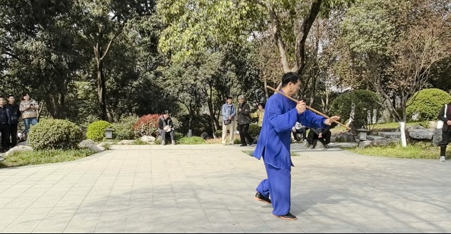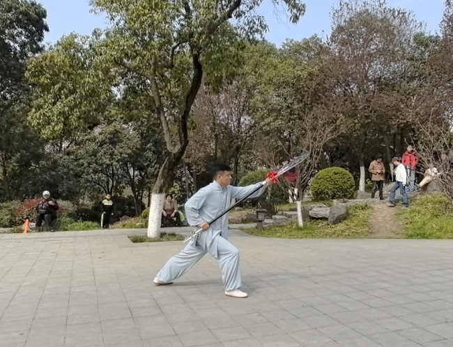 在活动现场沉香亭,队员们身着鲜艳的太极服装,精神抖擞,为太极人的首个节日做精心的准备,大家依次展演太极拳套路、太极剑、太极扇、春秋大刀,棍术等。太极拳园活连贯,太极扇整齐划一,气韵沉稳,春秋大刀虎虎生威,太极剑上下翻舞,尽显太极阴阳调和,天人合一的大智慧,也展现出了全民健身的魅力所在。队员们的精彩表演博得了在场观众的热烈掌声与喝彩,活动成功的举办为宣传弘扬非遗项目太极文化做出了积极努力!