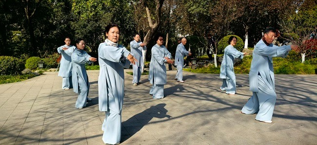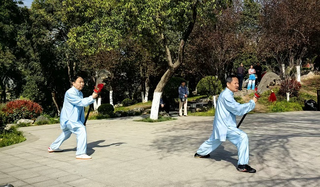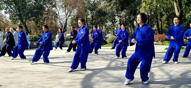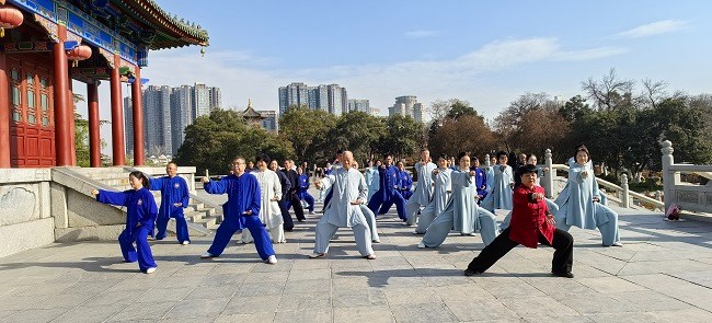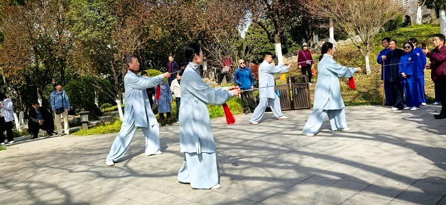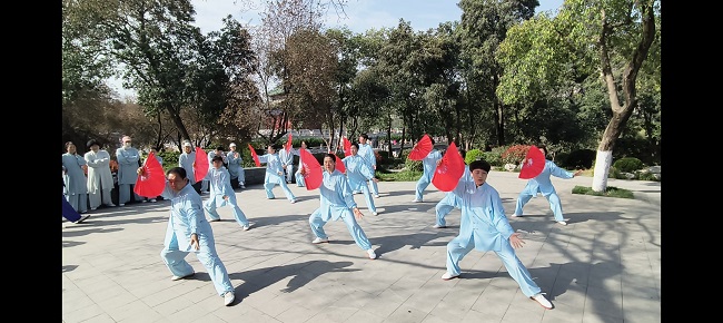 在活动现场沉香亭,队员们身着鲜艳的太极服装,精神抖擞,为太极人的首个节日做精心的准备,大家依次展演太极拳套路、太极剑、太极扇、春秋大刀,棍术等。太极拳园活连贯,太极扇整齐划一,气韵沉稳,春秋大刀虎虎生威,太极剑上下翻舞,尽显太极阴阳调和,天人合一的大智慧,也展现出了全民健身的魅力所在。队员们的精彩表演博得了在场观众的热烈掌声与喝彩,活动成功的举办为宣传弘扬非遗项目太极文化做出了积极努力!
