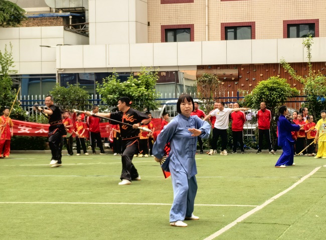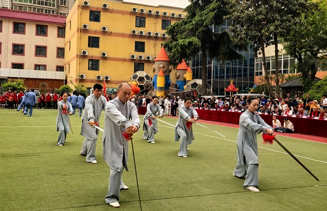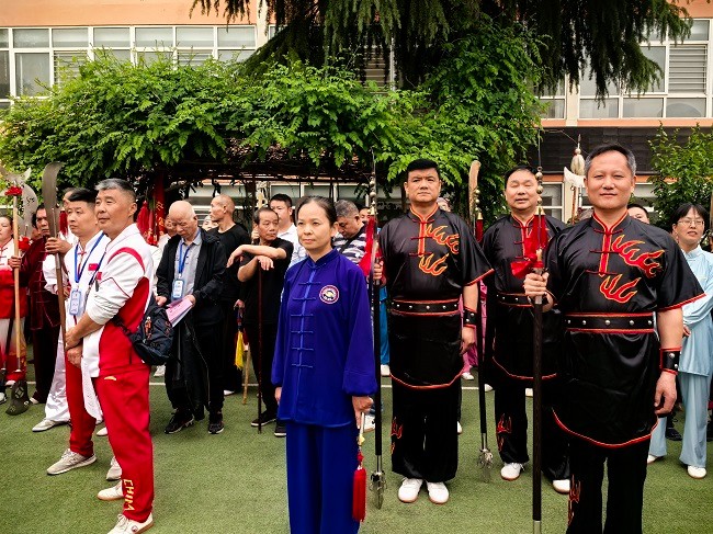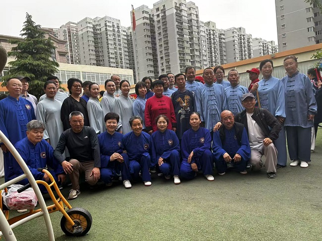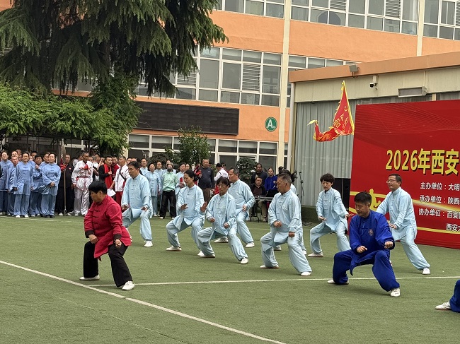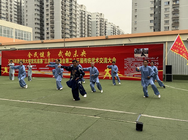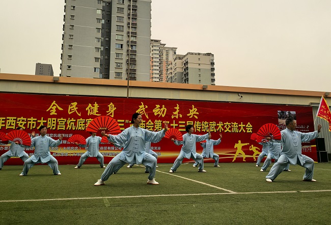 全民健身,舞动未央。2026年西安市大明宫炕底寨“三月三”古庙会第二十三届传统武术大会4月19日在大明宫的唐明宫幼儿园院内隆重举行,来自省市区武协的领导及参赛单位的武术爱好者参加了本次展演大会,西安陈发科太极拳研究会组队 四十多人参加了本次展演活动,西安陈发科太极拳研究会会长,市级非遗项目传承人刘宝欢亲自领衔进行了陈式太极拳38式的表演,队员们个个精神饱满,动作整齐划一,打出了陈式太极拳的刚柔并济,松活弹抖的特点。随后队员们又进行了陈式49剑的表演,陈式34式太极扇,陈式24式太极拳春秋大刀的表演,整个表演圆满成功!博得了在场领导和观众的热烈喝彩和掌声。